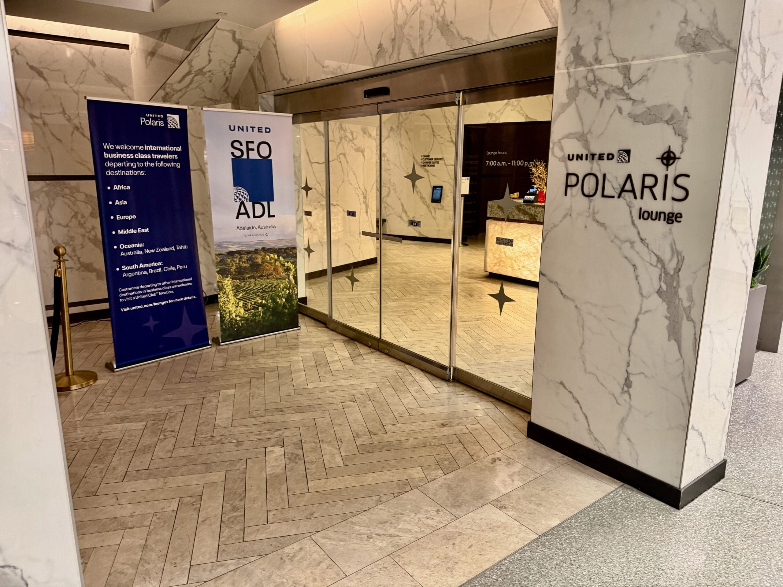 International Business Class passengers traveling on United have access to the lounge before departing, when connecting, and upon arrival. If traveling Business or First Class on a Star Alliance carrier (like Lufthansa, SWISS, ANA, etc.), the lounge is only available pre-departure. No guests are allowed unless you are traveling in First Class on a Star Alliance member airline. Check-in for the lounge is right inside the doors.